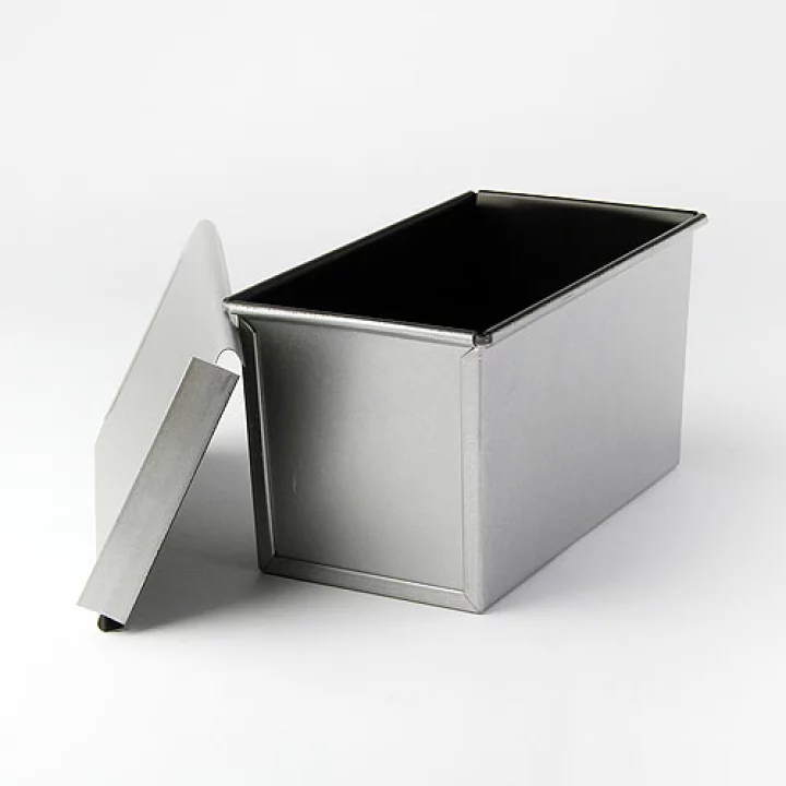 フタ付きの長方形の型で、これに生地を入れてフタをしたまま焼くことで、あの四角くてまっすぐな食パンが焼き上がります。